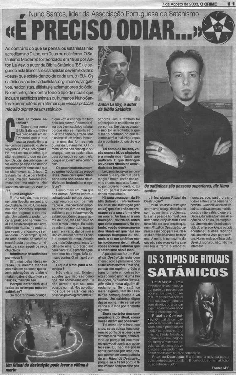 Após um contacto telefónico de Paulo Fernandes, jornalista d'O Crime, e uma longa pré-explicação de Satanismo, um Administrador da APS disponibilizou-se para uma entrevista via telefone. O resultado é o que se segue.